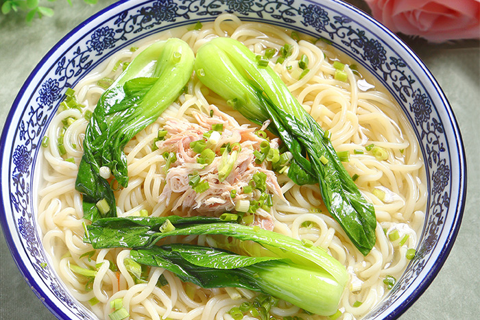 2.鍋內(nèi)燒水將面條煮熟撈出,裝入碗內(nèi);
