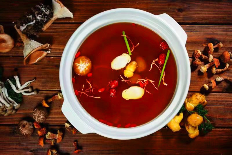1.鍋具中加入牛肝菌風味底料100克,開水1500克,一起調勻;